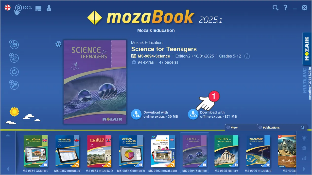 В mozaBook Вы можете загружать наши книги как онлайн, так и офлайн. Офлайн-версия всегда требует больше свободного места на жестком диске, но после загрузки Вы сможете открывать книги и использовать их вместе с интерактивным содержанием без активного подключения к Интернету; (3D-сцены, видео, задания)