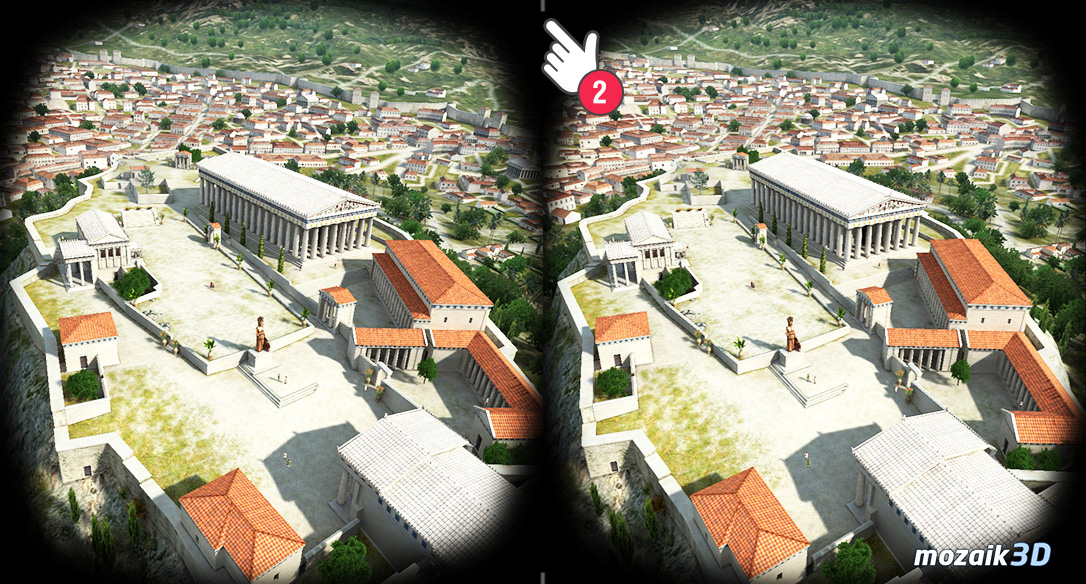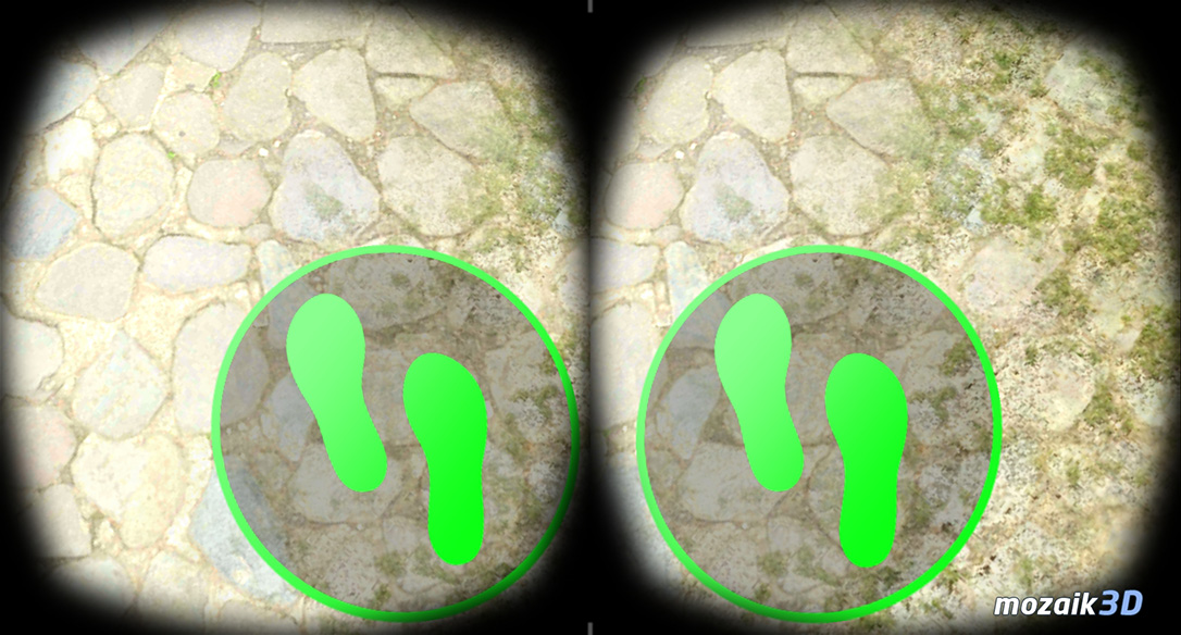 ほとんどの 3D シーンでは、VR ヘッドセットを使ってバーチャルウォークを体験することができます。そのためには、スマートフォンを装着できる VR ヘッドセットと、無料でダウンロードできる mozaik3D アプリが必要です。