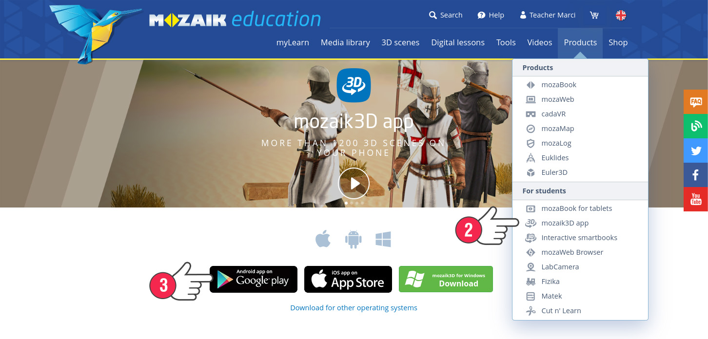 Θα βρεις την εφαρμογή mozaik3D και στο μενού Προϊόντα (2) . Μπορείς να κάνεις την εγκατάσταση και από εδώ, κάνοντας κλικ στο πλήκτρο Google play (3).