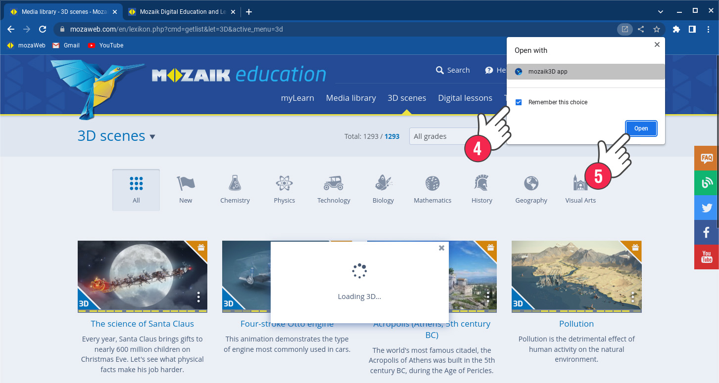 Αφού εγκατέστησες με επιτυχία την εφαρμογή mozaik3D, κάνε κλικ σε ένα οποιοδήποτε μοντέλο 3D. Στο μήνυμα που εμφανίζεται στον περιηγητή διαδικτύου επέλεξε το τετραγωνάκι (4) και κάνε κλικ στο πλήκτρο Άνοιγμα (5). Με αυτόν τον τρόπο τα μοντέλα 3D θα ανοίγουν με το πρώτο κλικ.
