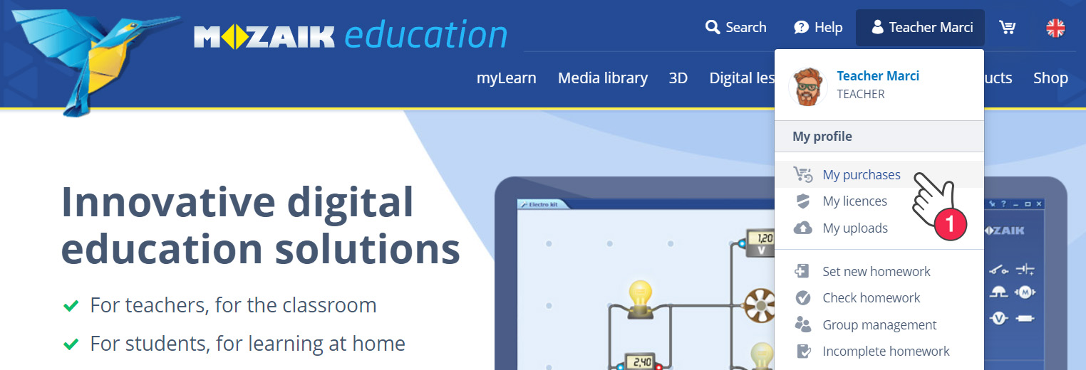 When you are logged in, you can find your purchased products in 'My purchases' in the drop-down menu that opens when you click your name (1).