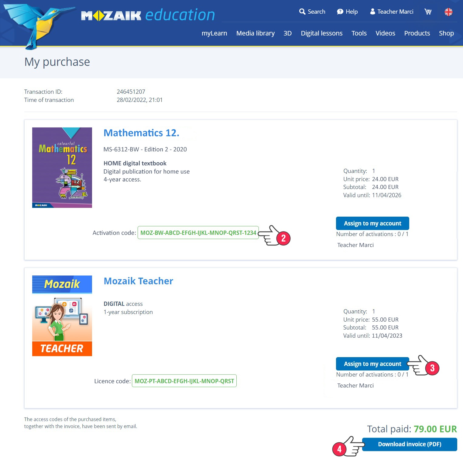 Here you will find the activation codes and licence codes of your purchased products (2). You can also activate your digital publications or your Mozaik Student / Teacher subscription by simply clicking to assign them to your account (3). You can also download the invoices for these products (4).
