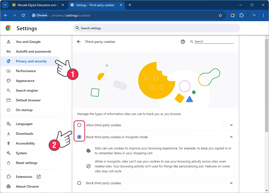 2. Защита и сигурност (1) => Бисквитки от други сайтове