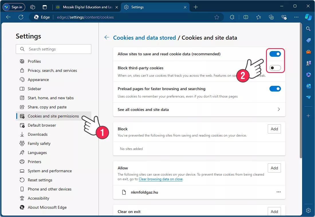 2. Разрешение за бисквитки и уебсайтове (1) => Обработка на бисквитки и уебданни и изтриването им