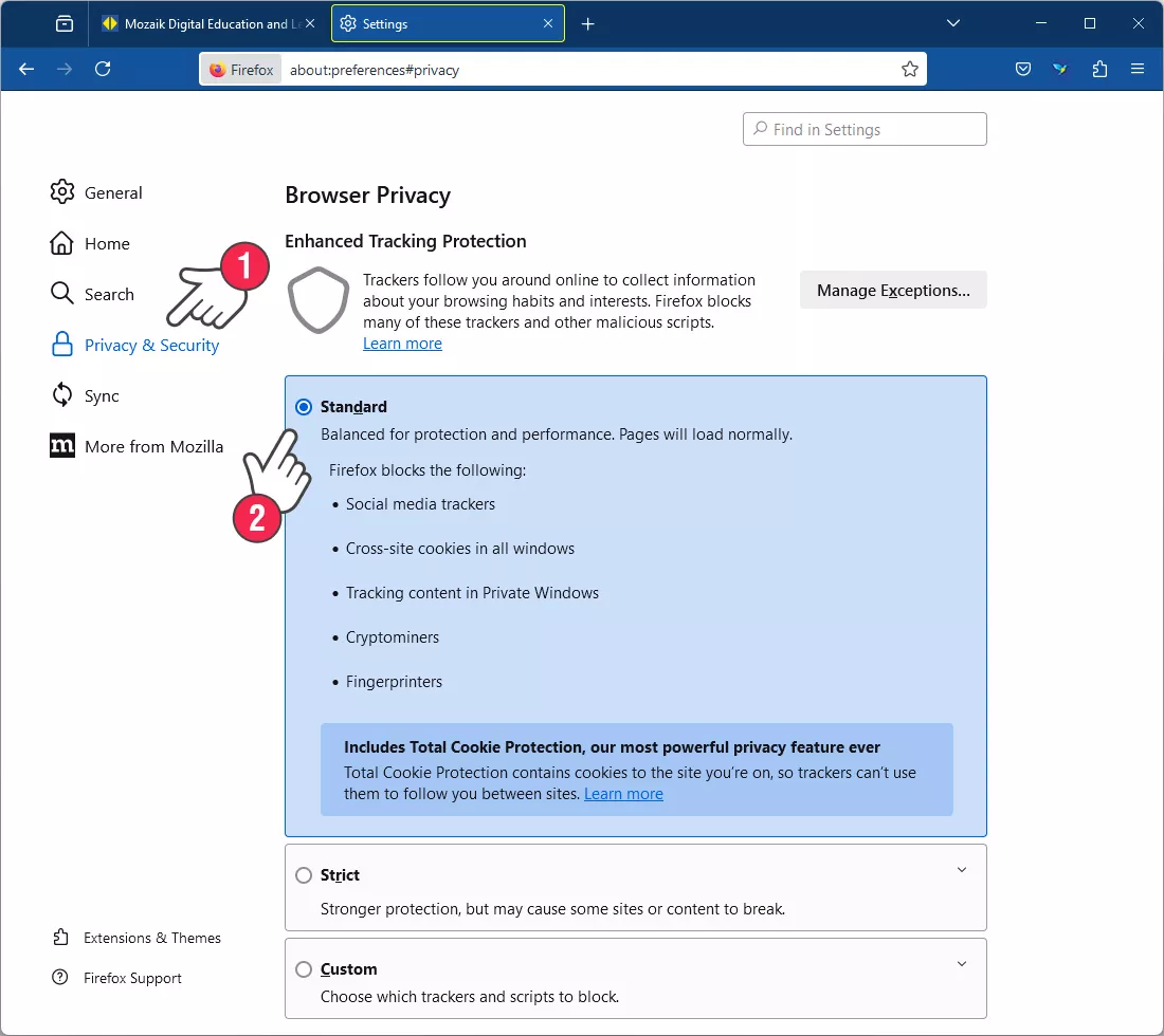 За безпрепятственото функциониране на mozaWeb при ползване трябва да се разрешат бисквитките (cookies). Без тях ще бъде затруднена работата на функциите регистрация, влизане или пазаруване, например. Тук показваме как да бъдат разрешени бисквитките в някои от най-често използваните браузъри. Кликнете върху името на браузъра за повече информация във връзка с настройките за бисквитки.