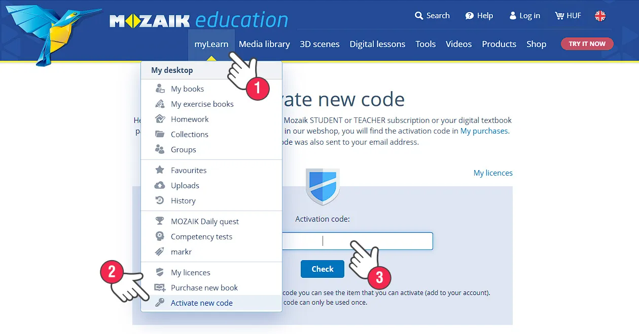 If you have not done it yet, activate your Mozaik TEACHER / Mozaik STUDENT licence. To do that, log in with your user account on mozaweb.com. Click on the myLearn (1) => Activate new code (2) menu (or on the link) and enter the Mozaik TEACHER / Mozaik STUDENT activation code (3):
