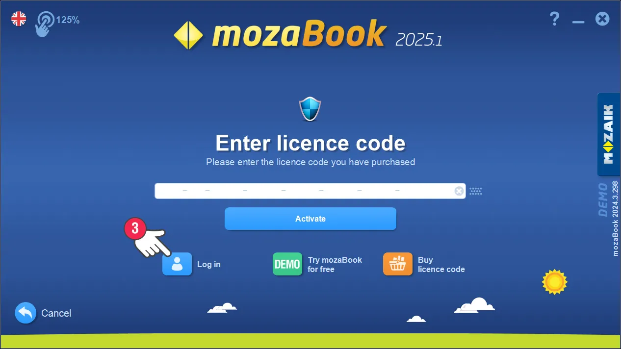 If mozaBook asks for a licence code (see image below), do not worry, just click on the log in button (3) and enter your mozaWeb username and password. Now you should be able to use mozaBook.