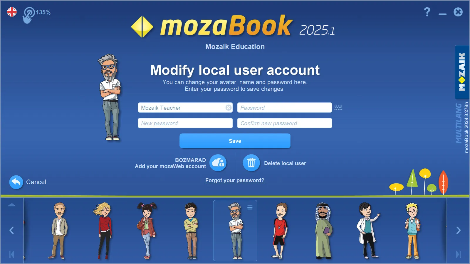 mozaBook tillater at flere brukere kan bruke programmet på samme maskin (f.eks. flere lærere i samme klasserom). Tegningene, notatene, presentasjonene, og annet innhold opprettet eller satt inn i programmet, lagres alltid på kontoen til den aktive lokale brukeren, og vil derfor kun være synlig for denne brukeren. Det er derfor nødvendig for programmet å kunne identifisere lokale brukere.