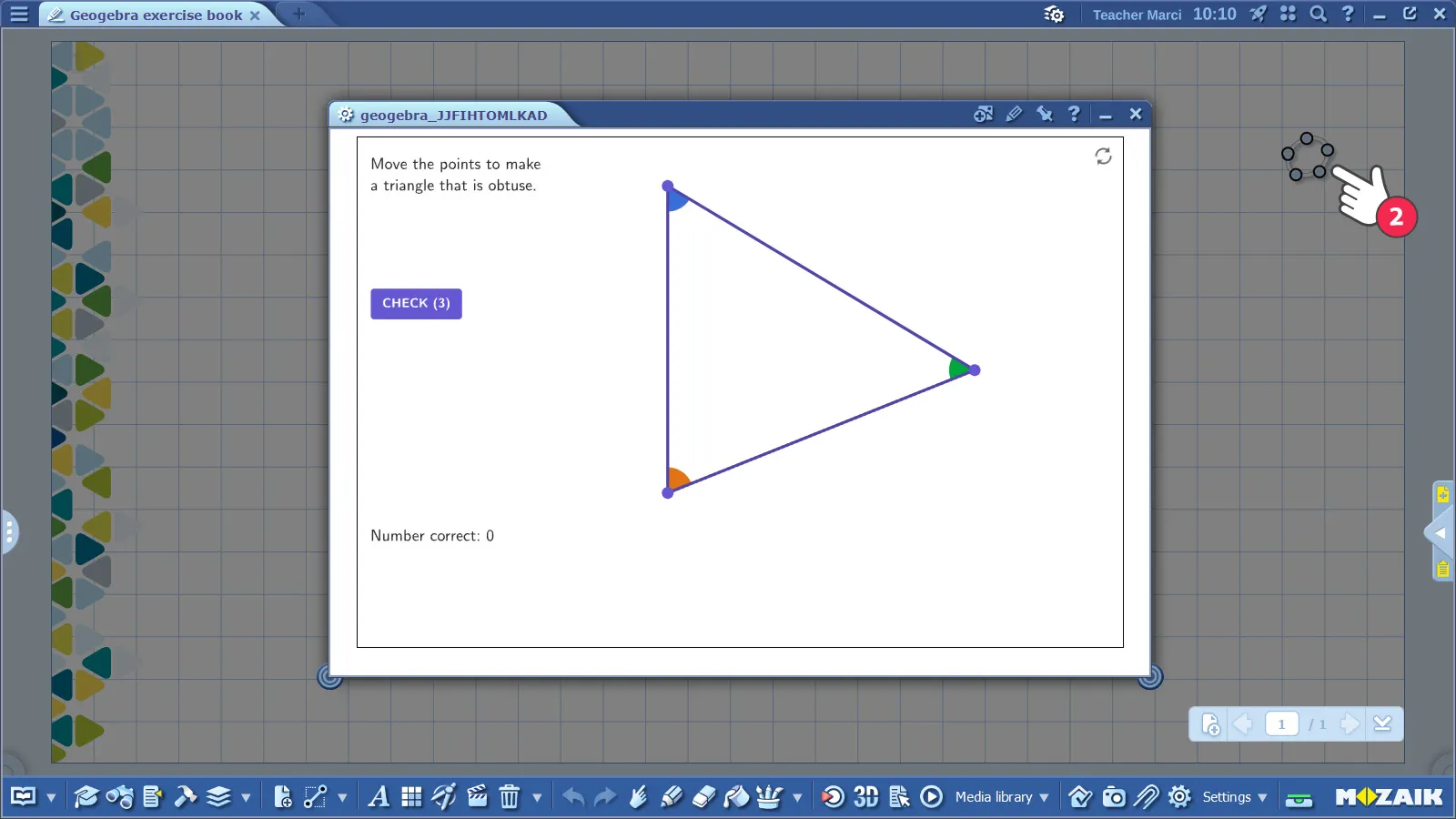 В mozaBookban már вече е достъпно и съдържание на GeoGebra. GeoGebra файловети са с .ggb разширение, списъкът с тях може да се види в Медийната библиотека, след като кликнете на Geometria (1).