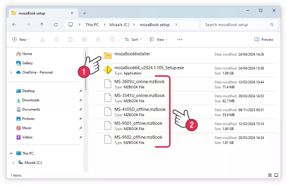 Завантажені книги з розширенням .mzBook будуть поміщені в теку C:\Program Files (x86)\Mozaik\mozaBook\books\. Якщо ви скопіюєте файли .mzBook до інсталятора (2), то вони також будуть інстальовані.<2>