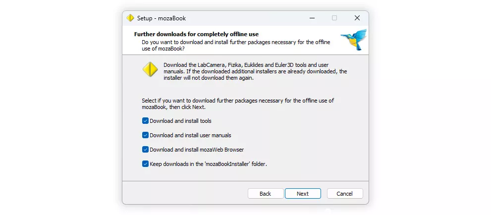 Вибрані компоненти буде завантажено з Інтернету і поміщено до теки mozaBookInstaller.