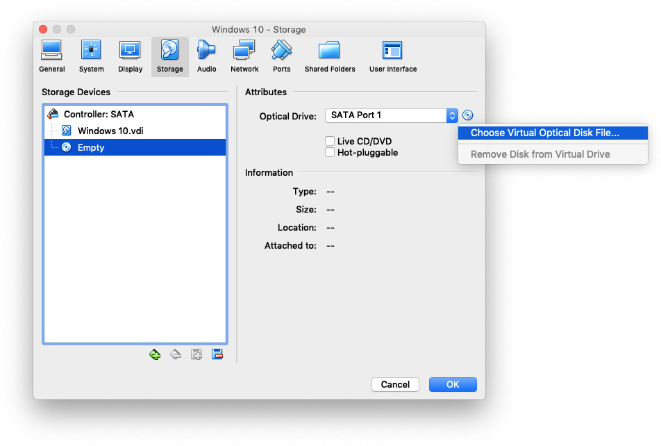 След създаването натискаме бутона Конфигуриране , за да направим настройкките на виртуалната машина. Тук, в менюто “Складиране”, избираме драйвъра Празен CD, кликваме върху дясната иконка CD, за да се появи сваленият вече от сайта на Microsoft пакет Windows 10.