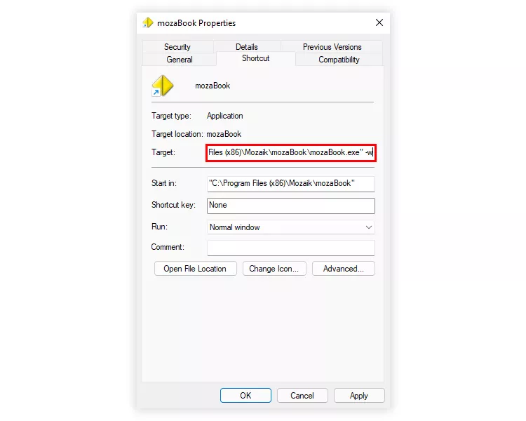 У вікні яке відкрилося, знайдіть рядок Об'єкт цей рядок, зазвичай містить "C:\Program Files (x86)\Mozaik\mozaBook\mozaBook.exe". Додайте пробіл в кінець цього рядка, та допишіть "-w".