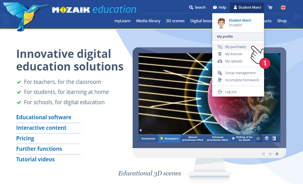You can find your purchased products in 'My purchases' in the drop-down menu that appears when you click your name on the page header (1).