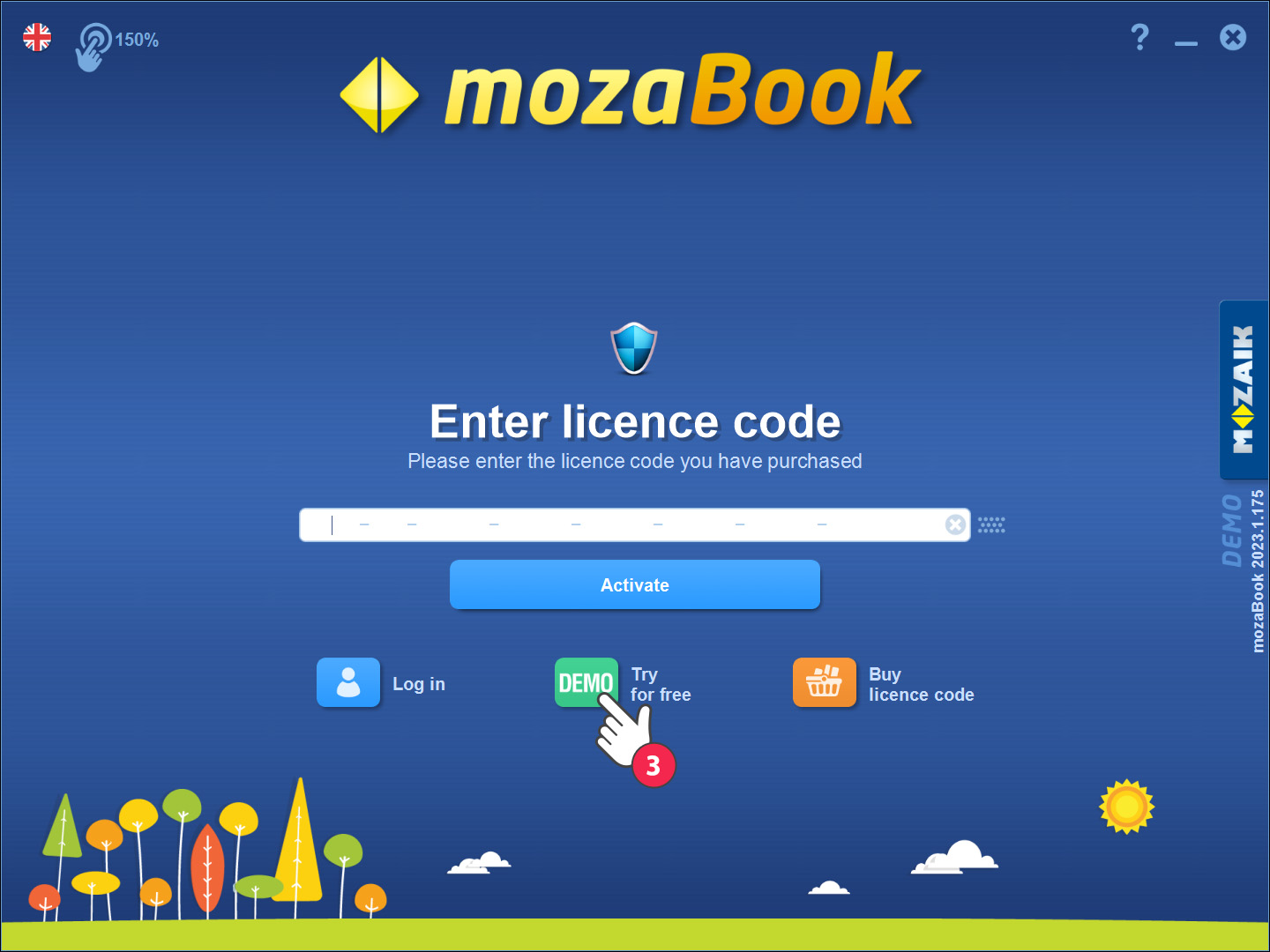 Започнете инсталирането, като следвате указанията. След инсталиране пуснете програмата mozaBook. Ако нямате лиценз за mozaBook CLASSROOM / mozaBook SCHOOL-LAB или Mozaik STUDENT / Mozaik TEACHER, изберете демоверсията (3):