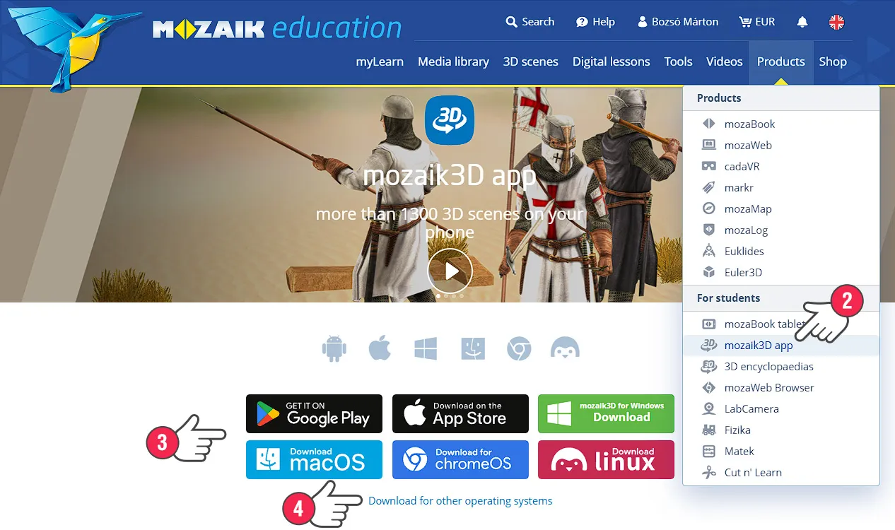 Nếu không có thông báo nào hiển thị, hãy nhấn vào Sản phẩm => ứng dụng mozaik3D (2) để tải xuống trình cài đặt (3) tương ứng với hệ thống của bạn. Ngoài những nền tảng phổ biến nhất, bạn cũng có thể tải xuống trình cài đặt cho các hệ điều hành khác, chẳng hạn như Bảng tương tác Android (4).