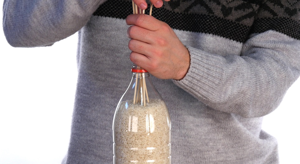 Да видим как се може да се повдигне бутилка, пълна с ориз, с няколко бамбукови клечки.