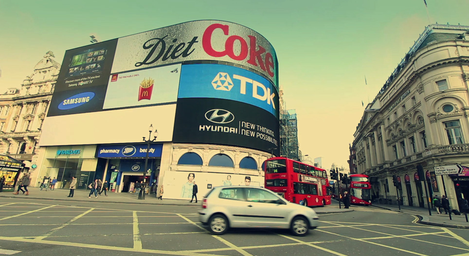 "Пикадили съркъс" е известен с огромните си видеодисплеи и дигитални билбордове, разположени в северната част на площада, на стените на една ъглова сграда.
