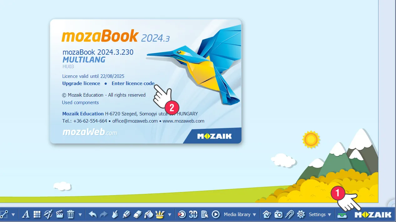След влизане кликнете в лентата с инструменти налого на Mozaik (1) и в появилия се прозорец изберете вписване на лицензионен код (2).