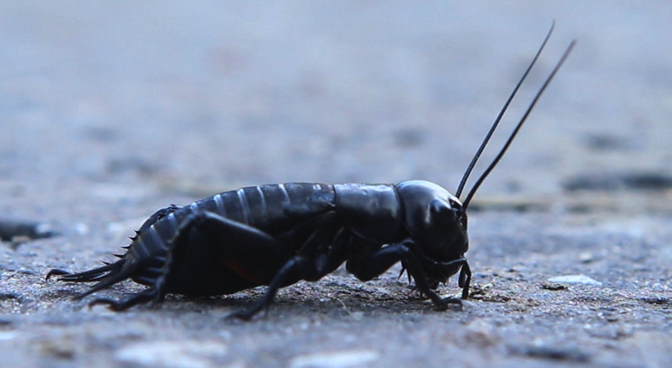 It can be easily recognised by its bulky, shiny black body and its rather large, helmet-like head. The male produces a characteristic chirping sound.