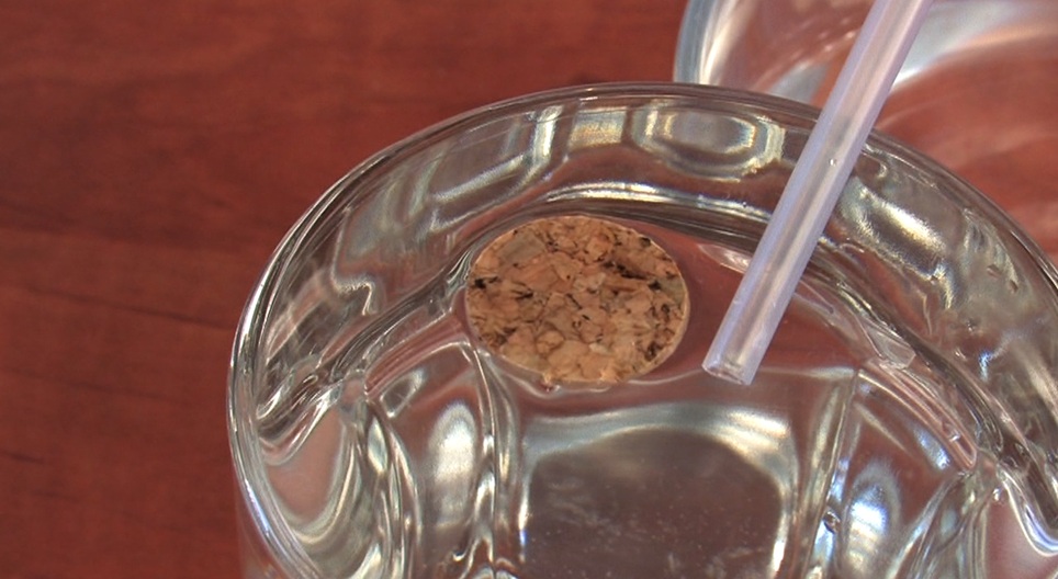 How does a piece of a cork behave on the surface of a glass of water? You can examine that in this experiment.
