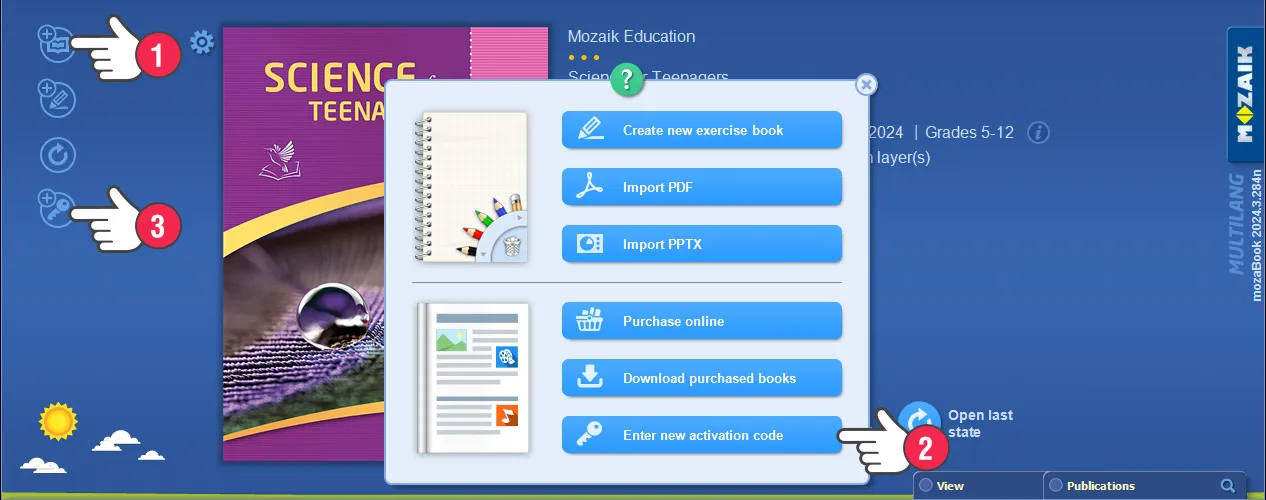 En la página de inicio de mozaBook, haz clic en el icono Añadir nueva publicación (1), luego elige el menú Introducir nuevo código de activación (2). O haz clic directamente en Introducir el código de activación (3).