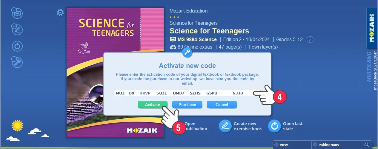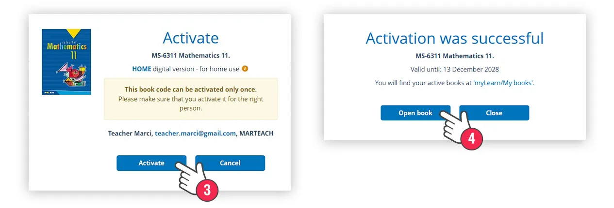 Si has introducido un código válido, un panel de mensaje aparecerá mostrando información sobre la publicación correspondiente al código de activación. Si la información es correcta, haz clic en el botón Activar (3). Si la activación ha sido exitosa, aparecerá un mensaje, incluyendo la fecha de validez del libro, y podrás abrir el libro enseguida (4).