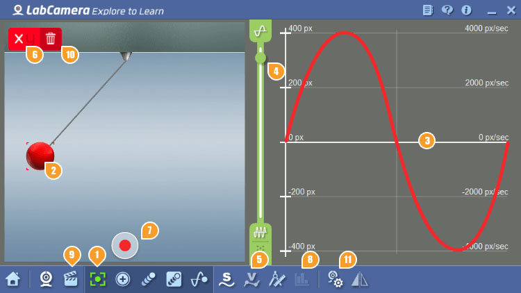 Med kinematikfunktionen kan man følge horisontale og vertikale bevægelsesmønstre (forskydning, hastighed og acceleration) for et eller flere objekter i realtid. Softwaren kan maksimalt behandle 3 udvalgte objekter samtidigt for komplekse kinematiske eksperimenter.
