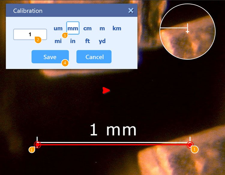 Kalibrering af størrelse|Med kalibrering kan der udføres målinger baseret på et referenceemne. Anbring et objekt med kendt størrelse foran kameraet og klik på kalibreringsknappen. Derefter markeres start- og slutpunkt på det kendte segment, og værdi og måleenhed indtastes. Fremover bliver alle måleberegninger baseret på det definerede segment. |