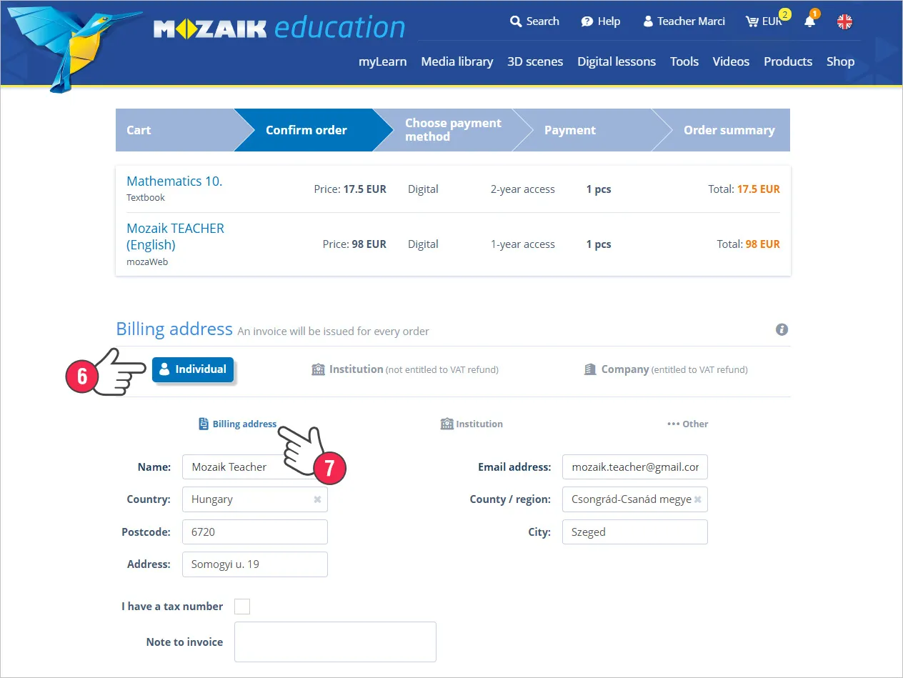 Om du ikke har oppgitt faktureringsinformasjon tidligere, må du oppgi (5) og lagre (6) denne på siden for bestillingsbekreftelse.