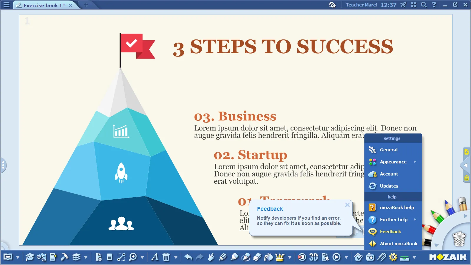 Якщо у вас є якісь технічні проблеми або помилки під час роботи в mozaBook, чи коментарі щодо використання mozaBook, ви можете надіслати нам відгук про це. Для цього натисніть на значок шестерні на панелі інструментів, а потім виберіть Зворотний зв'язок.